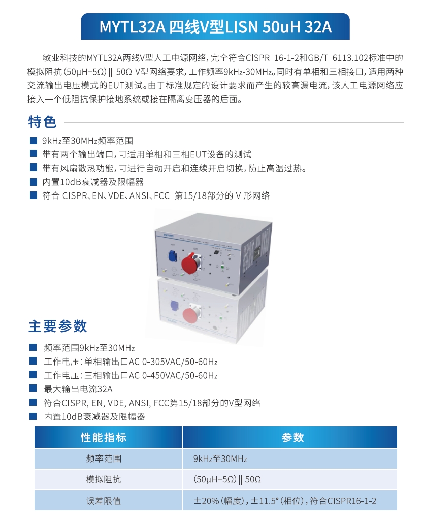 MYTL32A两线V型人工电源网络,完全符合CISPR 16-1-2和GB/T 6113.102标准中的模拟阻抗(50uH+50)500V型网络要求,工作频率9kHz-30MHz。同时有单相和三相接口,适用两种交流输出电压模式的EUT测试。由于标准规定的设计要求而产生的较高漏电流,该人工电源网络应接入一个低阻抗保护接地系统或接在隔离变压器的后面。