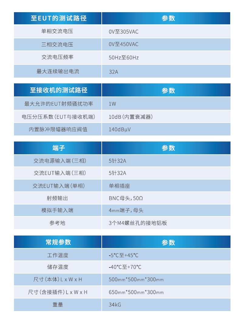 • 带有两个输出端口,可适用单相和三相EUT设备的测试